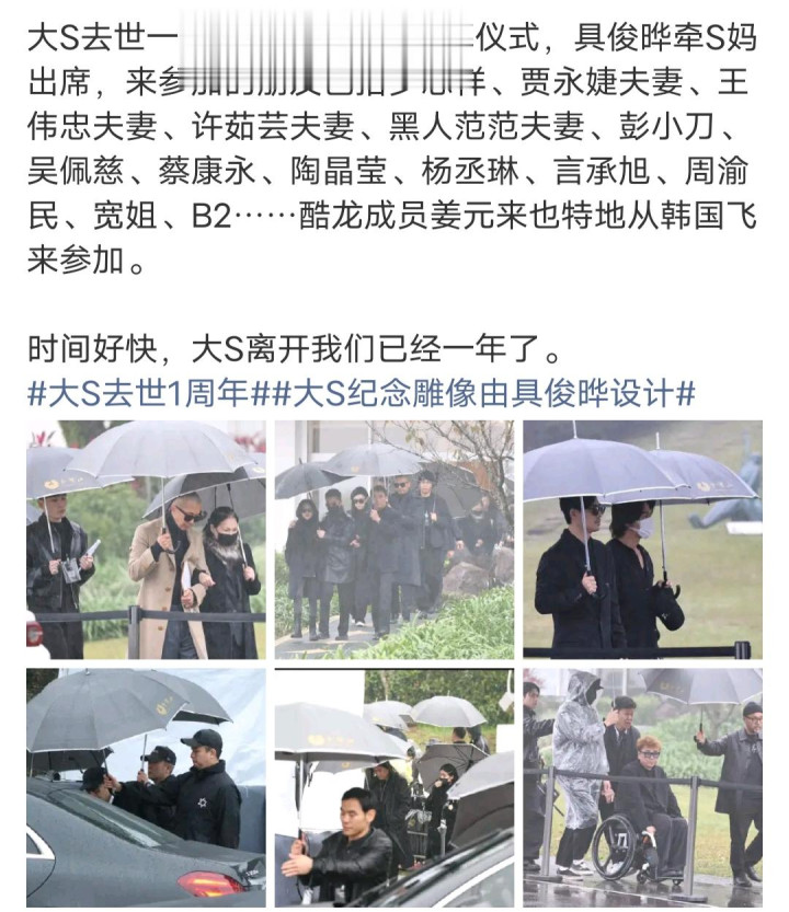 小S夫妇、蔡康永、黑人范玮琪夫妇、言承旭、周渝民、杨丞琳等数十位圈内好友都冒雨参加大S的周年祭。